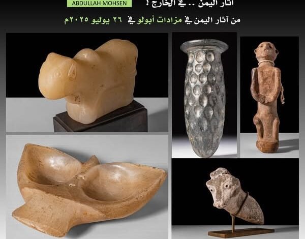 في مشهد جديد من هذا النزيف المستمر، تستعد دار مزادات “أبولو للفنون” في لندن لعرض خمس قطع أثرية يمنية نادرة في مزادها المقرر يوم 26 يوليو 2025، ضمن ما أطلقت عليه “مزاد الفنون القديمة الجميلة – مجموعة الأمير” وفق معلومات اطلع عليها مرصد بقش.