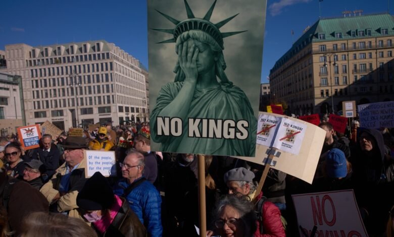 تحت لافتات تحمل تاجاً مشطوباً، خرج الأمريكيون من نيويورك إلى سان فرانسيسكو، مروراً بشيكاغو وبورتلاند، احتجاجاً على سياسات الهجرة، وتوسع السلطة التنفيذية، و”نغمة التفوق” التي يرددها ترامب في خطاباته.